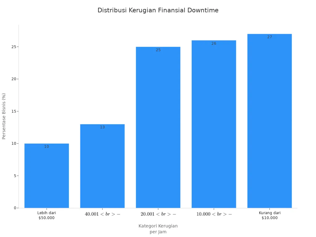Kamu bisa melihat contoh sederhana pada perusahaan manufaktur. Ketika downtime mesin terjadi selama sepuluh menit, jumlah produk yang dihasilkan langsung turun. Selain kehilangan output, perusahaan juga harus membayar biaya perbaikan dan gaji pekerja yang tidak produktif selama periode tersebut. Dalam kasus ini, kerugian downtime tidak hanya berasal dari pendapatan yang hilang, tetapi juga dari biaya tambahan yang muncul. Kamu harus memahami bahwa downtime singkat pun dapat menimbulkan kerugian besar. Manajemen downtime yang baik sangat penting untuk meminimalkan dampak negatif pada bisnis.