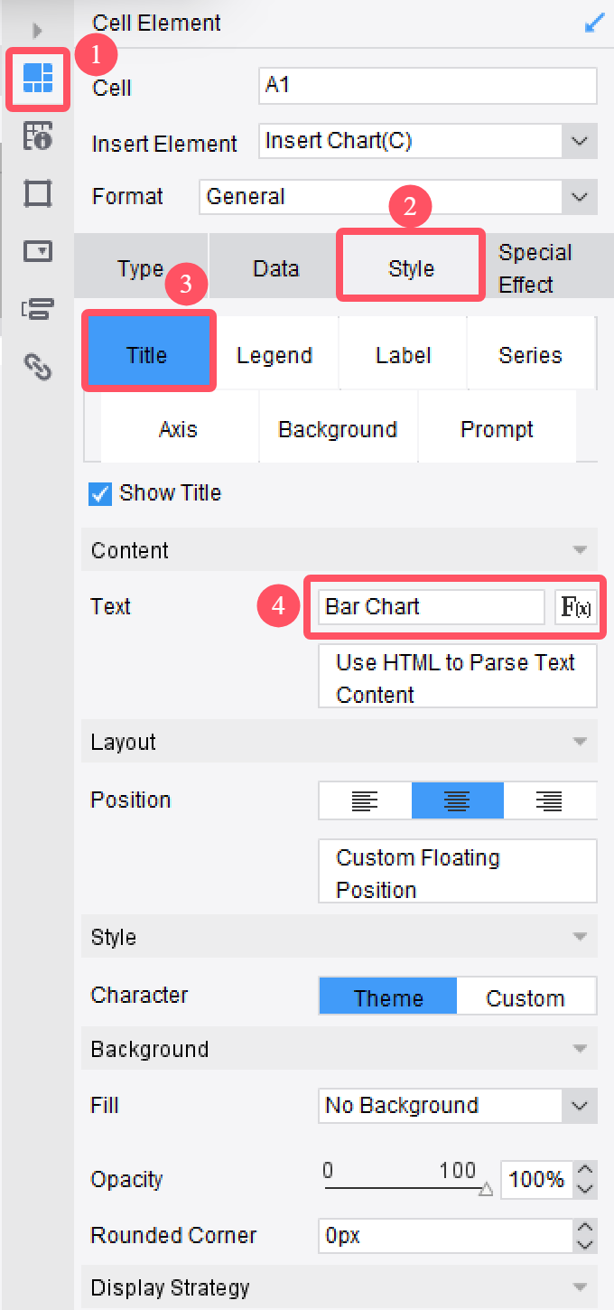 Style settings allow you to customize the appearance of your clustered bar chart. FineReport provides a range of options to enhance the visual appeal and clarity of your chart.