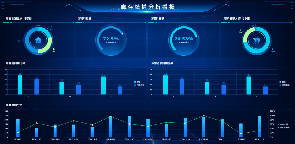 在這張庫存結構分析看板中,利用了圓環圖、折線圖、長條圖等圖表,使得庫存資料一目了然,財務、運營以及庫管人員,均可以根據物料的庫存數量,佔用資金的多少做ABC結構分析。