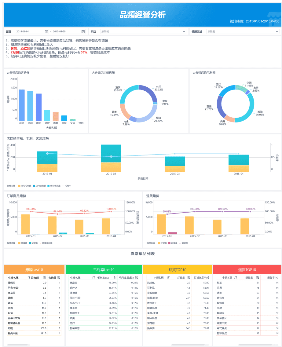 以長條圖、折線圖、圓餅圖、雷達圖等視覺化方式為主,適合快速看趨勢、占比、比較與異常變化。